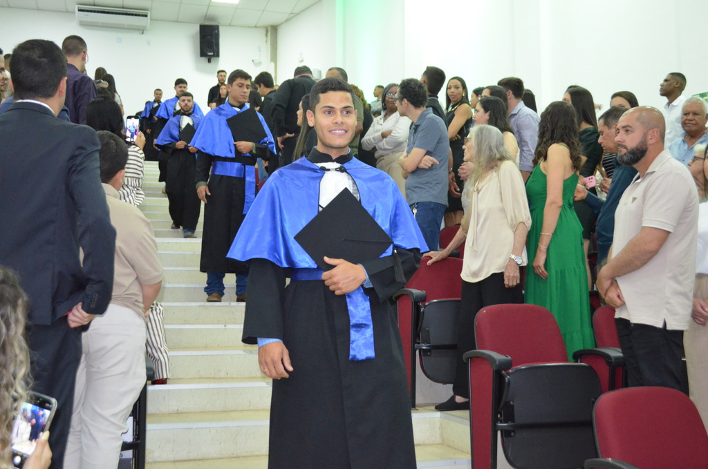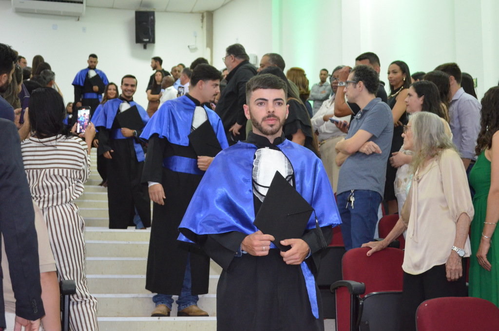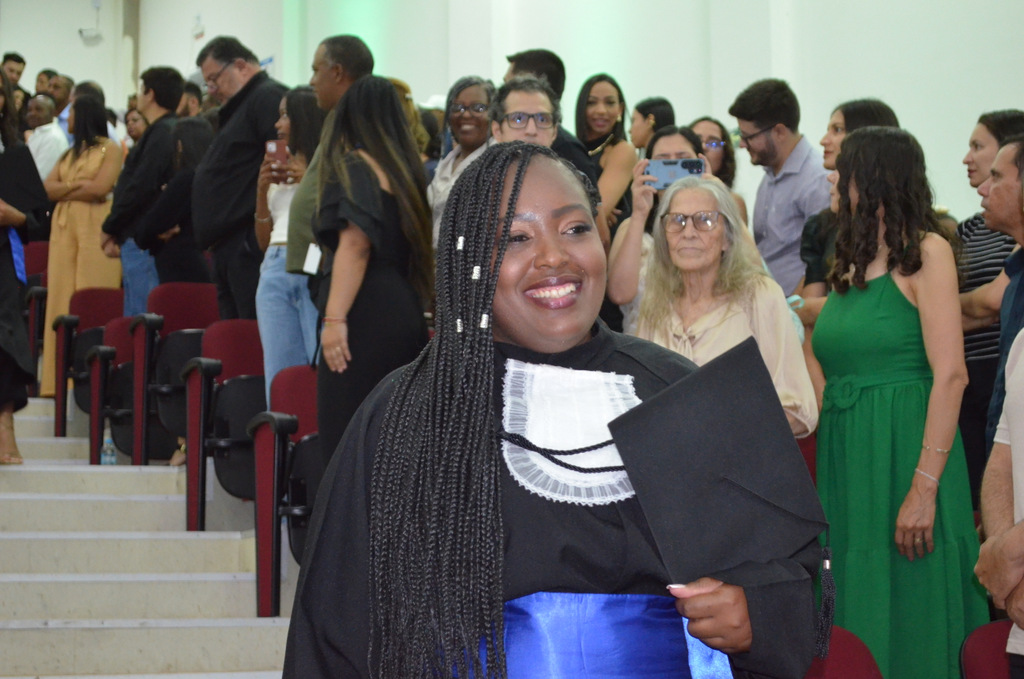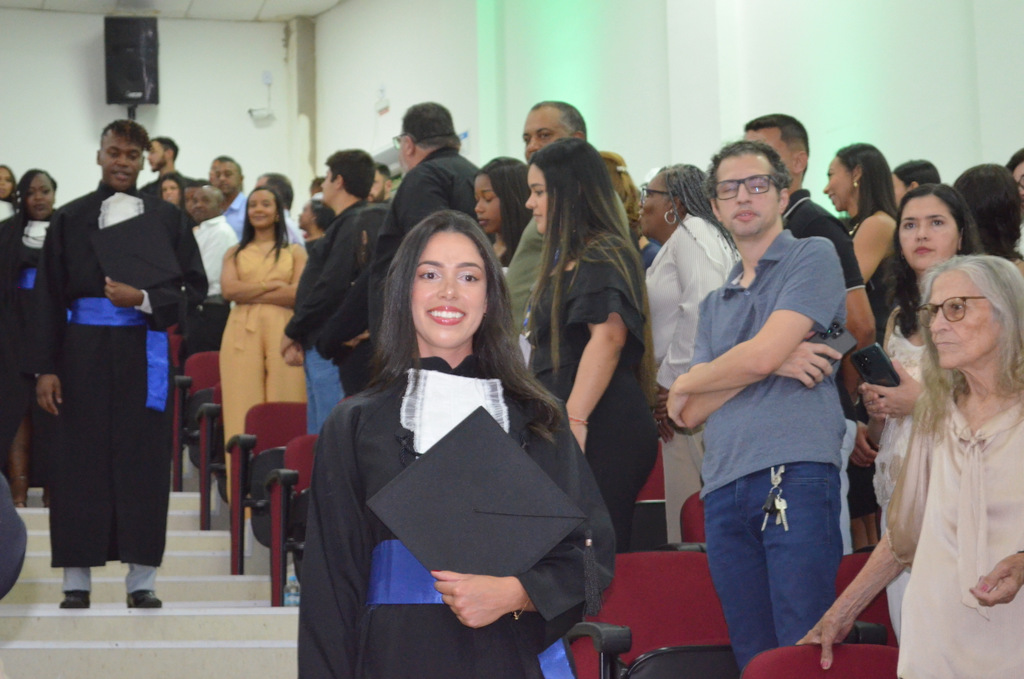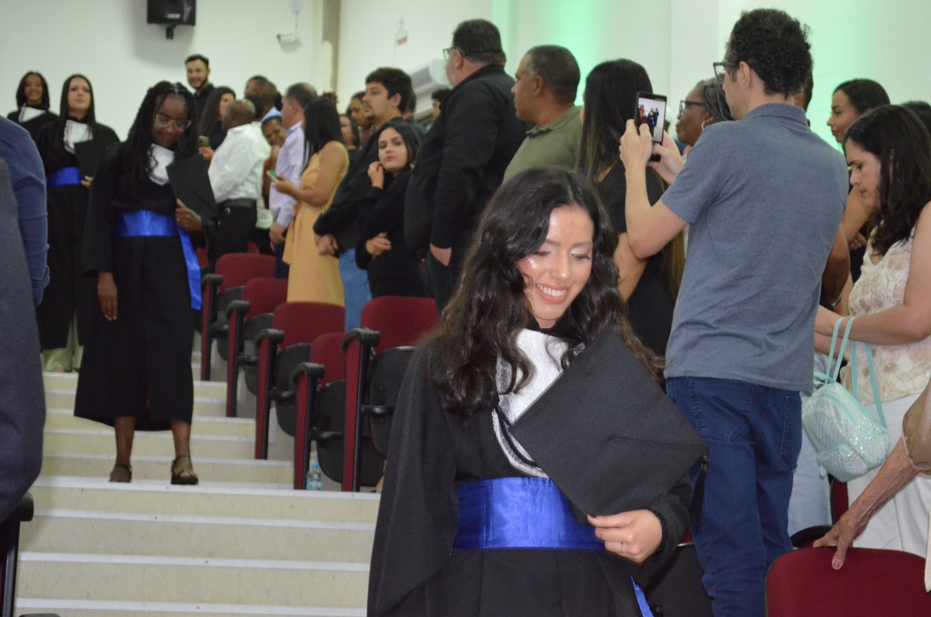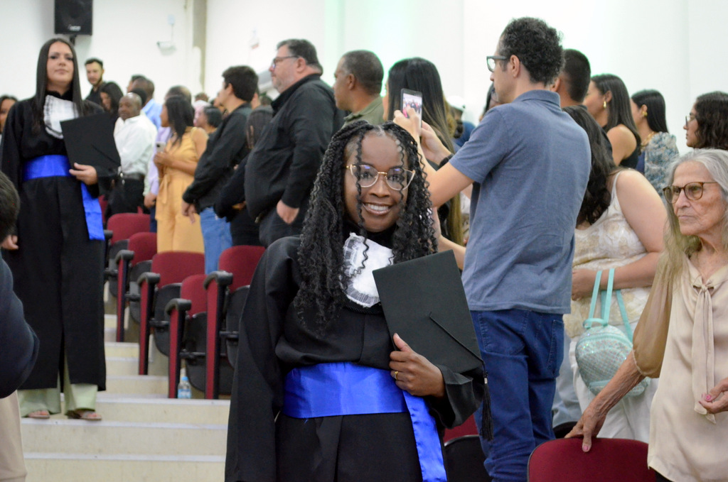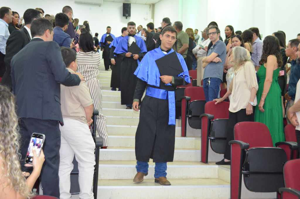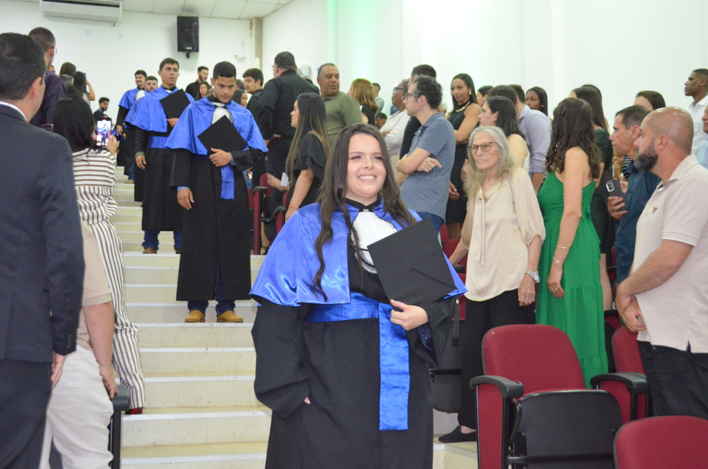 A solenidade terminou em clima de celebração, com a tradicional contagem regressiva e o lançamento dos capelos, simbolizando a conquista de uma etapa importante na vida acadêmica dos formandos.