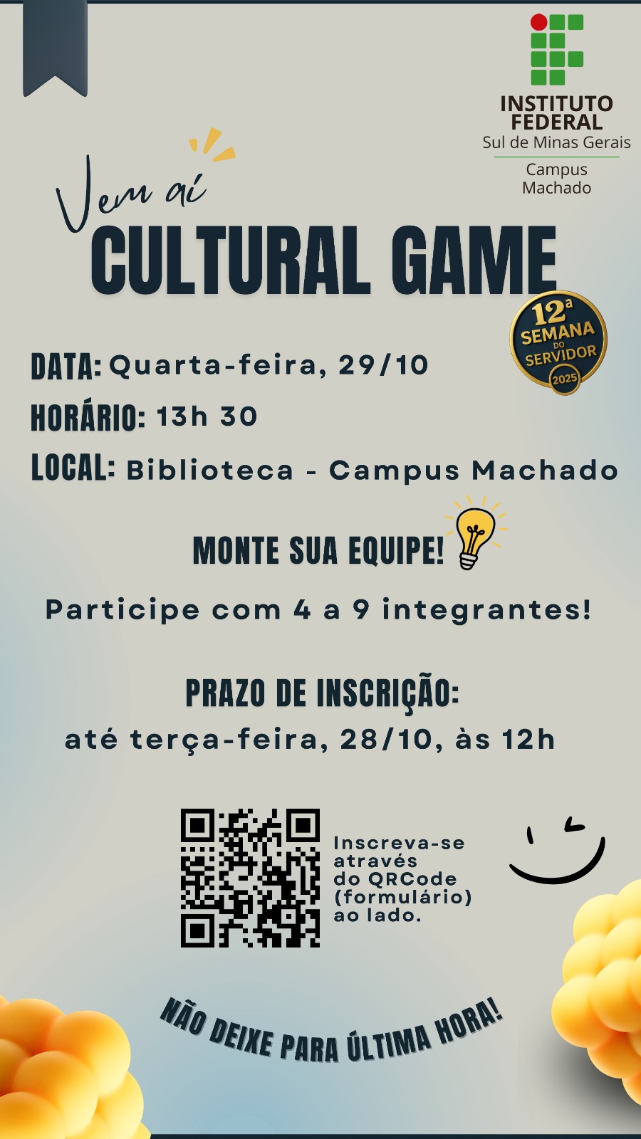 🎉Cultural Game (29/10) - Quiz interativo sobre as curiosidades do campus (clique aqui para se inscrever);