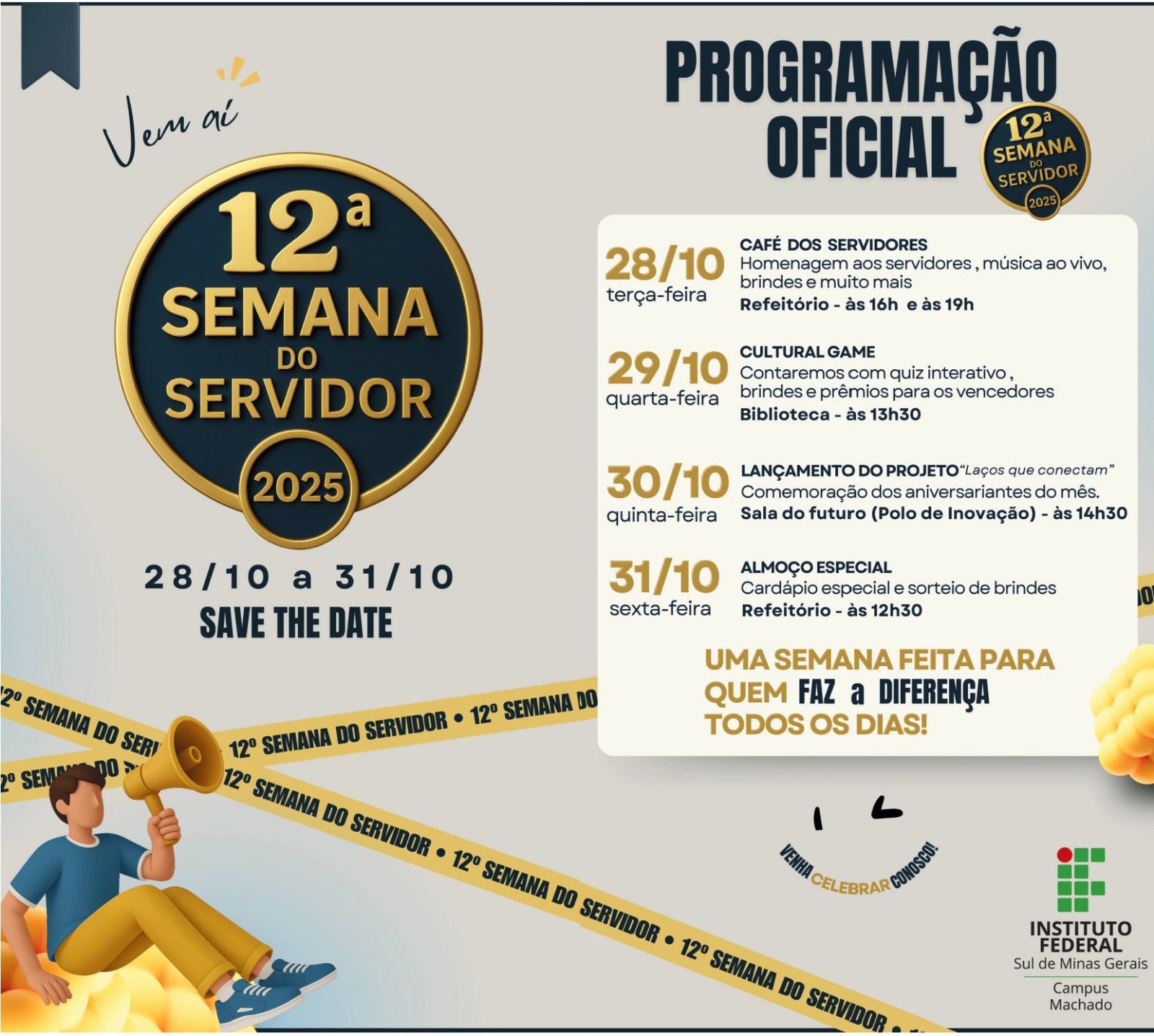 O IFSULDEMINAS - Campus Machado realiza entre os dias 28 à 31 de outubro, a 12ª Semana dos Servidores, com uma programação especial voltada à valorização, integração e reconhecimento dos servidores. O evento é uma iniciativa promovida pela Coordenadoria de Gestão de Pessoas, por meio do setor de Qualidade de Vida no Trabalho (QVT), e tem como objetivo fortalecer o sentimento de pertencimento, bem-estar e colaboração entre os membros da comunidade acadêmica.