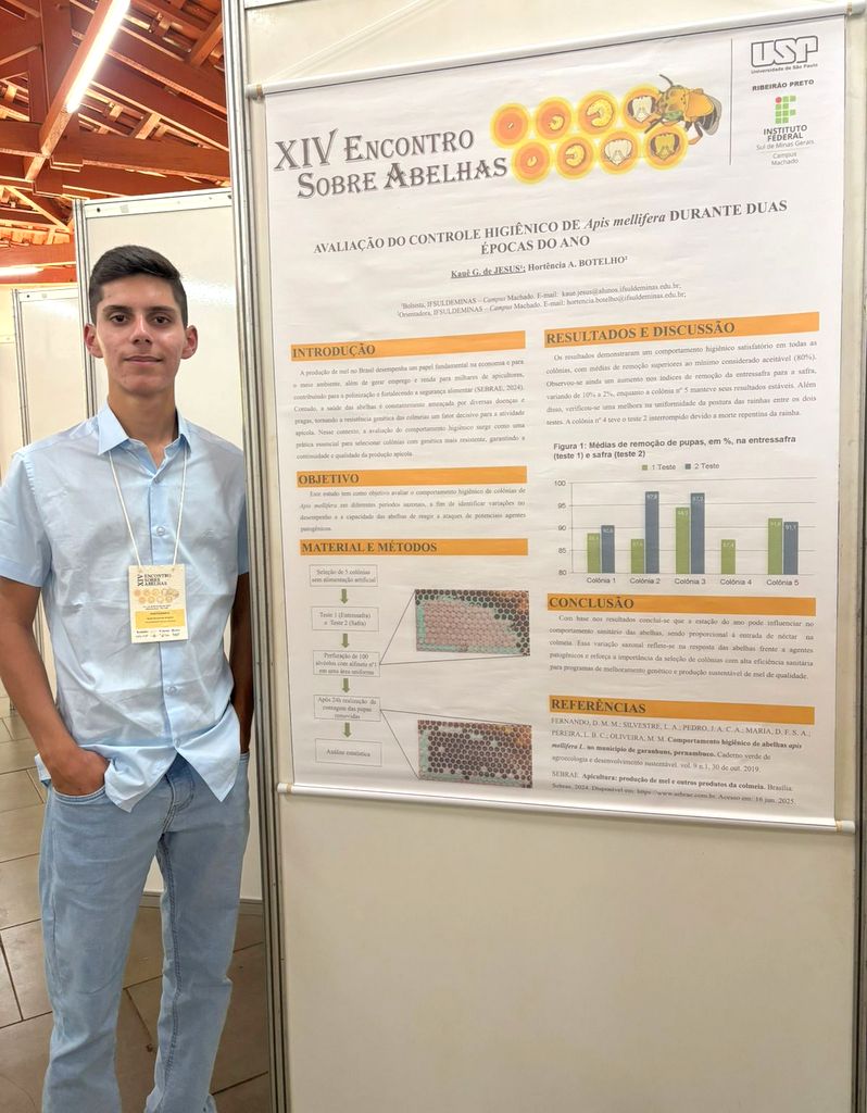 Agropecuária Hortência Botelho e o estudante de Zootecnia Kaue Gonçalves apresentaram dois trabalhos de pesquisa desenvolvidos no setor de apicultura do IFSULDEMINAS – Campus Machado: um estudo sobre controle higiênico em abelhas Apis mellifera e uma investigação realizada no meliponário, voltada às abelhas sem ferrão.