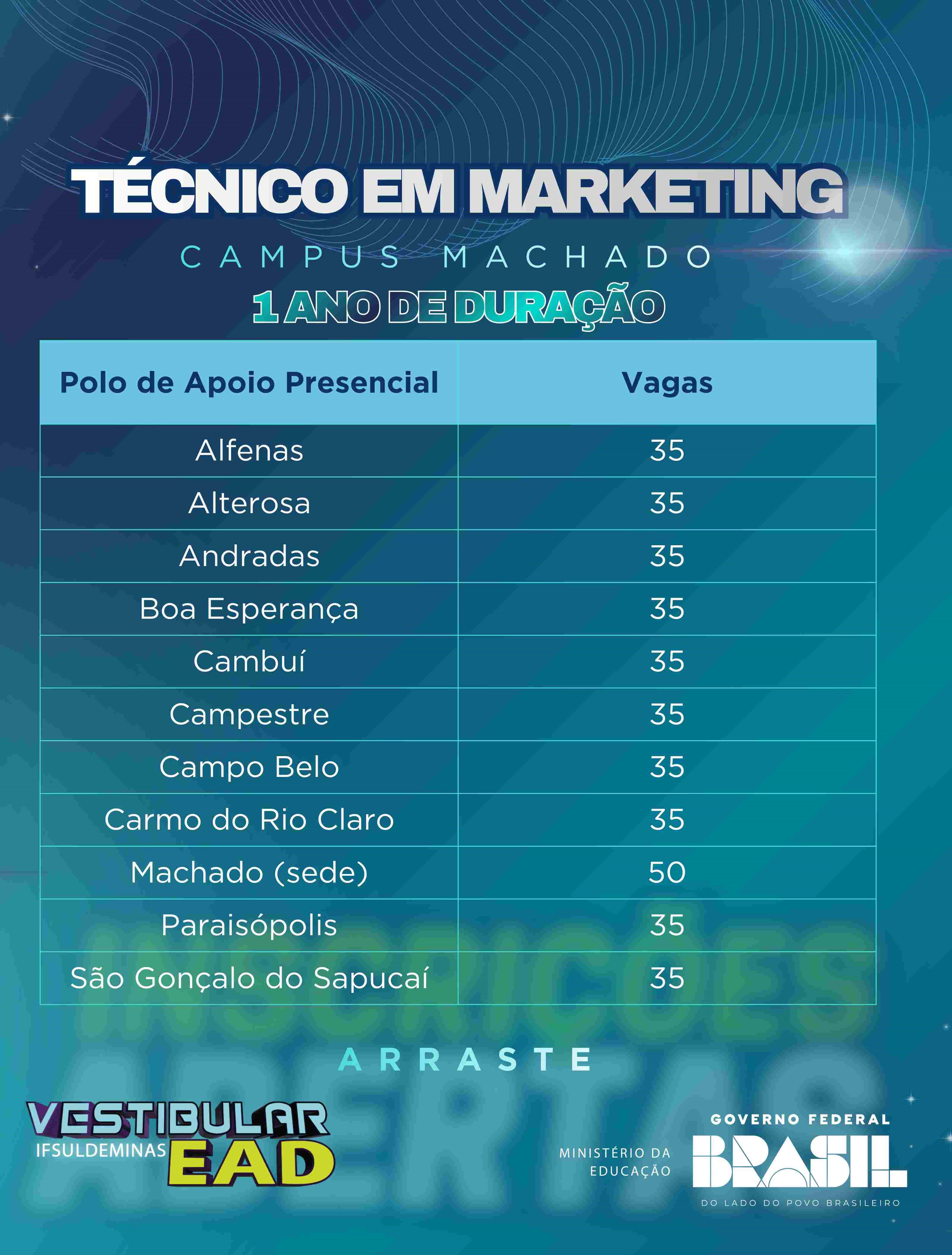 Para o ingresso no início de 2026, o Campus Machado oferece mais de 500 vagas, sendo 168 para os cursos superiores e 340 para os cursos técnicos integrados e subsequentes. Parte dessas vagas também será disponibilizada para ingresso via Sistema de Seleção Unificada (SiSU). O processo seletivo via SiSU é aberto pelo Ministério da Educação (MEC) no início do ano.