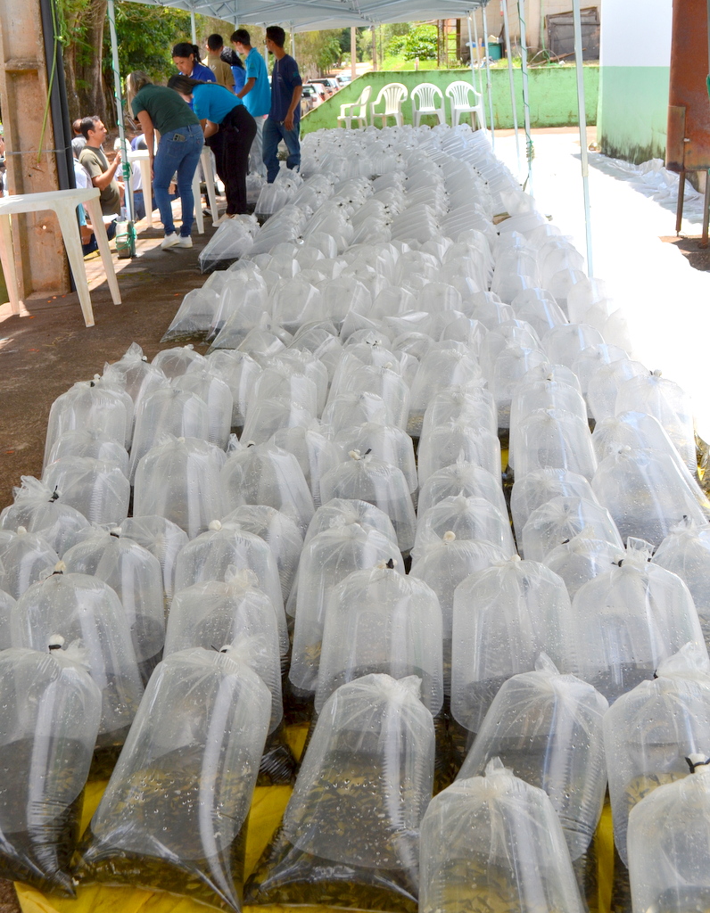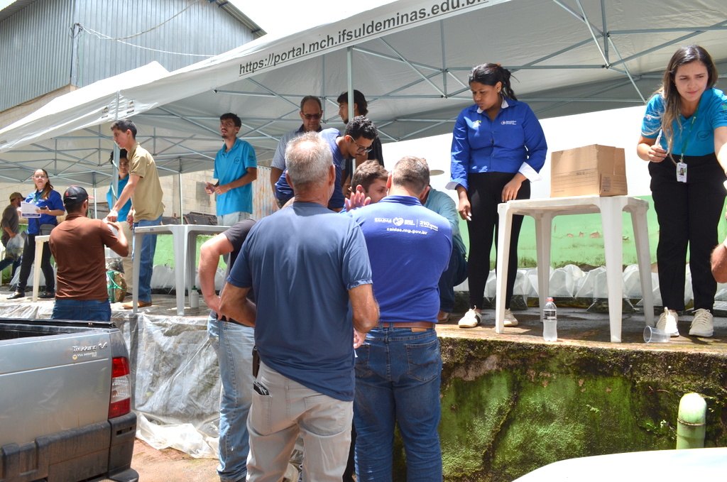Após as orientações, os produtores foram direcionados à área externa para retirada dos alevinos, com o apoio de estudantes e servidores na organização do fluxo.