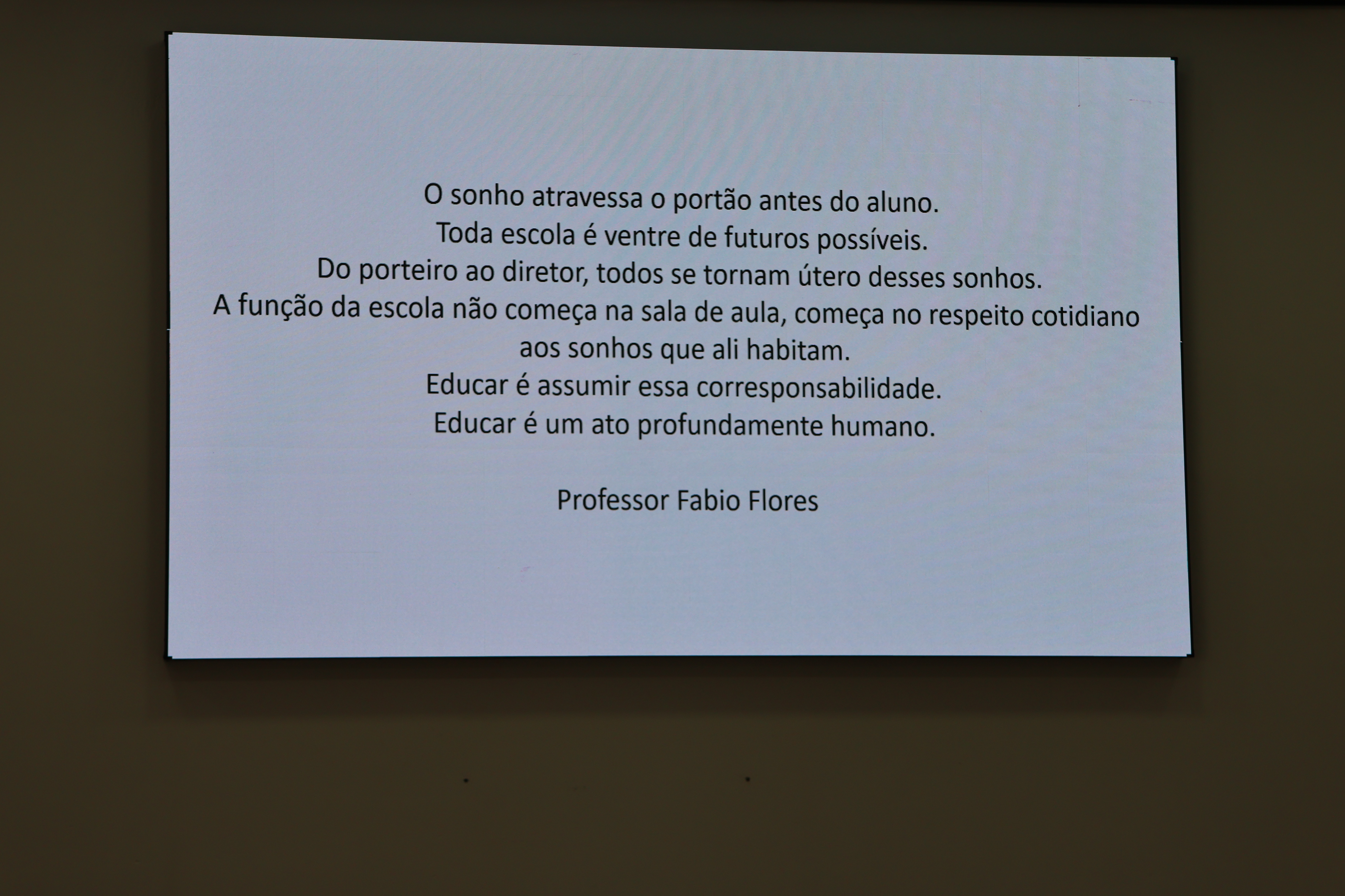 Segundo ela, a palestra realizada no início da semana de planejamento: “Do porteiro ao diretor, todo mundo é educador”, enfatizou o acolhimento, o olhar atento e a percepção integral do estudante, considerando suas dificuldades e contextos individuais.